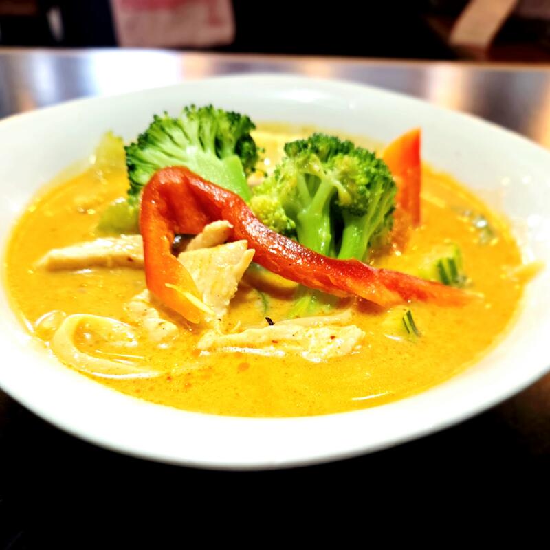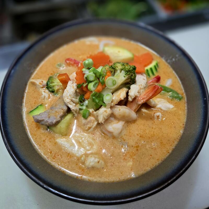 Udon noodles in red curry with vegetables