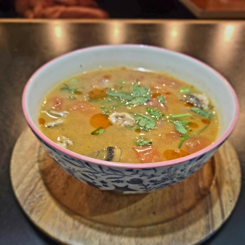 Thai Coconut milk soup with lemongrass, galangal, mushrooms, onion, tomatoes, and cilantro • Choice of Chicken or Tofu | Substitute Shrimp +$1.00
