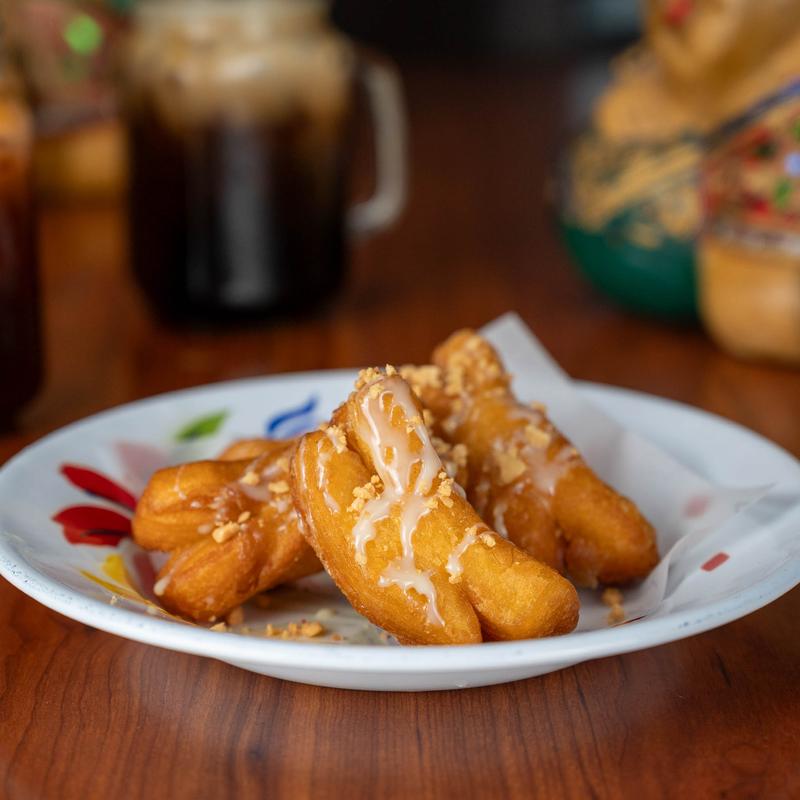 Fried Thai donuts with sweet condensed milk and chopped peanuts.