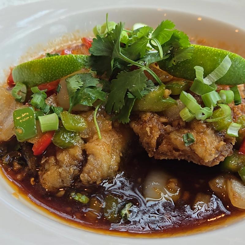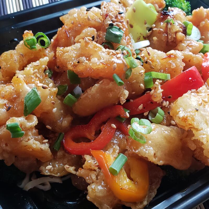 With house special three taste sauce, garnish with broccoli, bell pepper, scallions