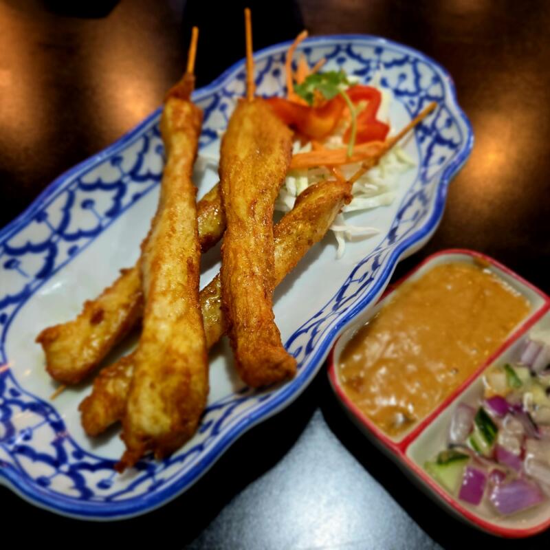 Marinated chicken tender on skewers, grilled and served with peanut sauce and cucumber sauce