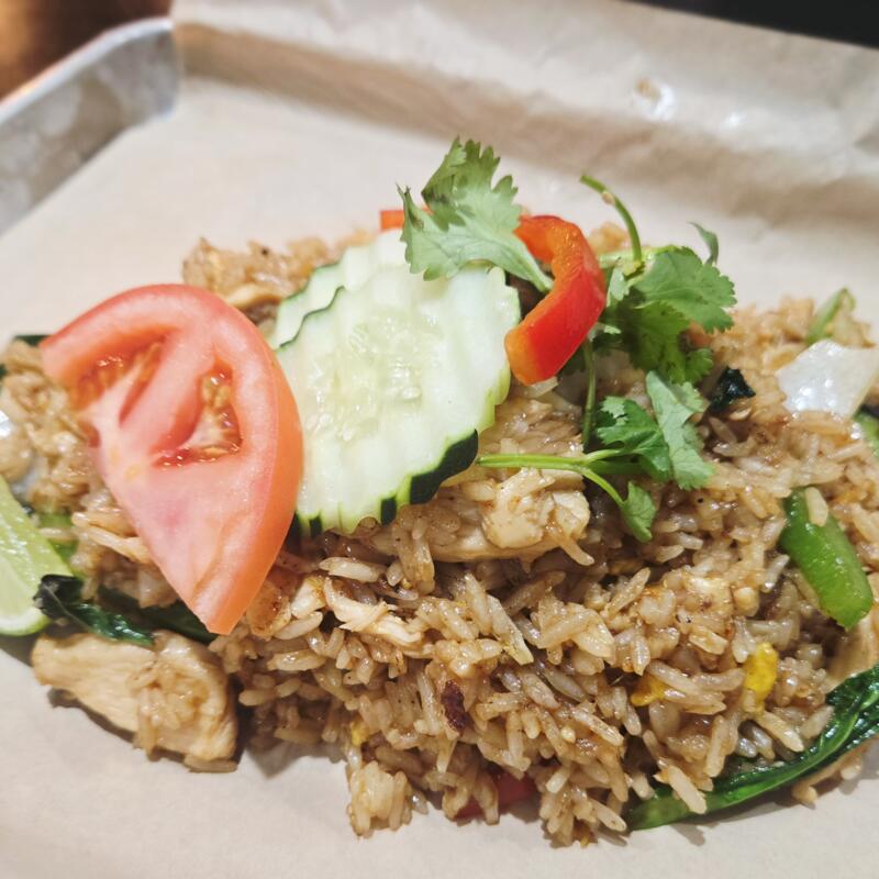 Stir-fried steamed rice with egg, onions, bell pepper, Thai basil, and amazing sauce • Choice of: Chicken | Vegetable | Tofu | Beef +$2.00 | Shrimp +$3.00 | Combination (Chicken, Beef, Shrimp) +$4.00